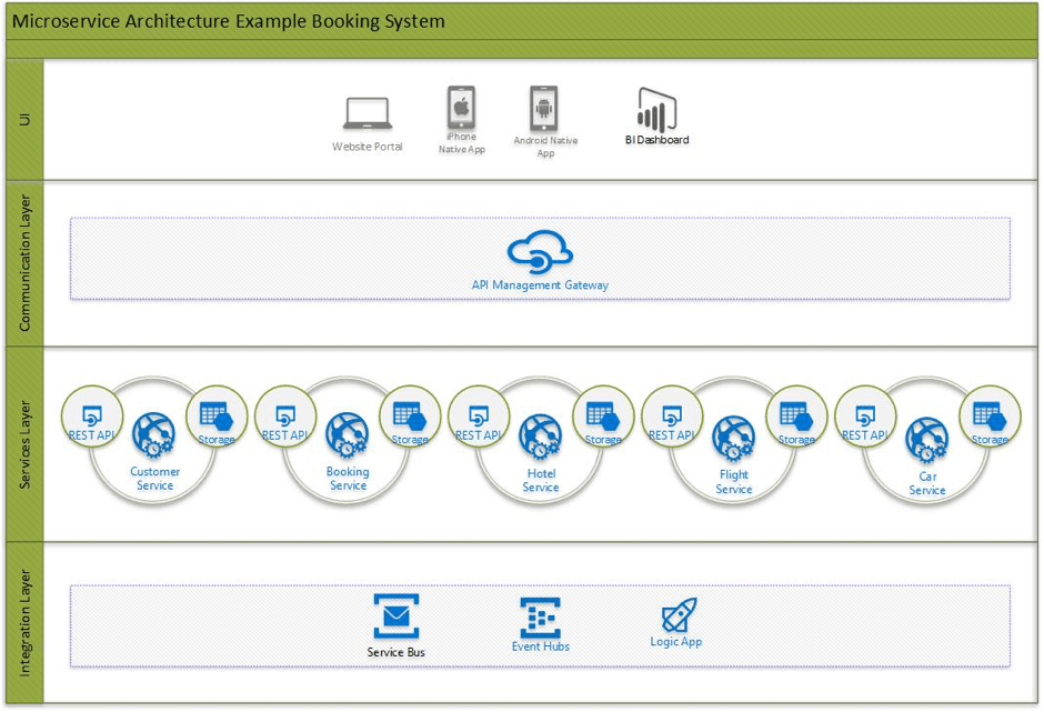 The service layer will contain all microservices which can be utilised by the organisation. In our example, we only have five services; however, in the real world it could be hundreds of services to handle each aspect of the system.